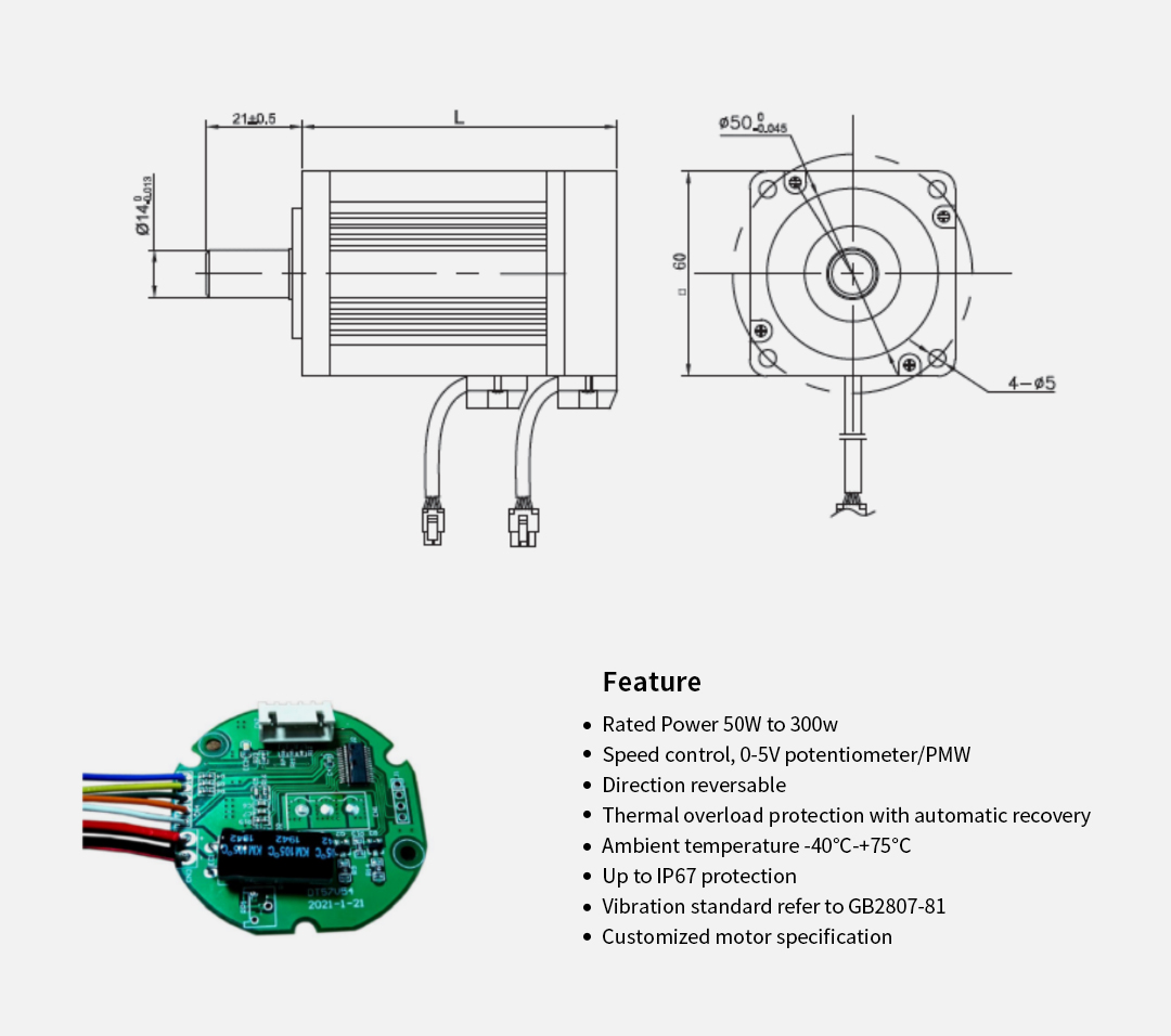 | Model | Number of poles | Number of phase | Rated voltage | Rated speed | Continuous stall torque | Rated torque | Rated power | Peak torque | Peak current | Torque constant | Back E.M.F | Rotor inertia | Body length | Voltage range | Speed Range | Weight |